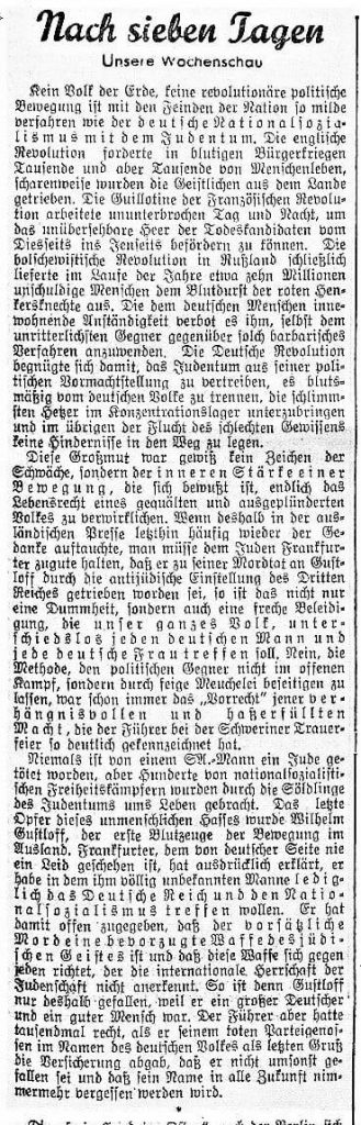 „Dieser Großmut“, so heißt es weiter, „war gewiß kein Zeichen der Schwäche, sondern der inneren Stärke einer Bewegung, die sich bewußt ist, endlich das Lebensrecht eines gequälten und ausgeplünderten Volkes zu verwirklichen.“ Wenn in der ausländischen Presse zu lesen sei, „man müsse dem Juden Frankfurter zugute halten, daß er zu seiner Mordtat an Gustloff durch die antijüdische Einstellung des Dritten Reiches getrieben worden sei, so ist das nicht nur eine Dummheit, sondern auch ein freche Beleidigung, die unser ganzes Volk, unterschiedslos jeden deutschen Mann und jede deutsche Frau treffen soll. Nein, die Methode, den politischen Gegner nicht im offenen Kampf, sondern durch seine feige Meuchelei beseitigen zu lassen, war schon immer das ‚Vorrecht‘ jener verhängnisvollen und haßerfüllten Macht, die der Führer bei der Schweriner Trauerfeier so deutlich gekennzeichnet hat.“