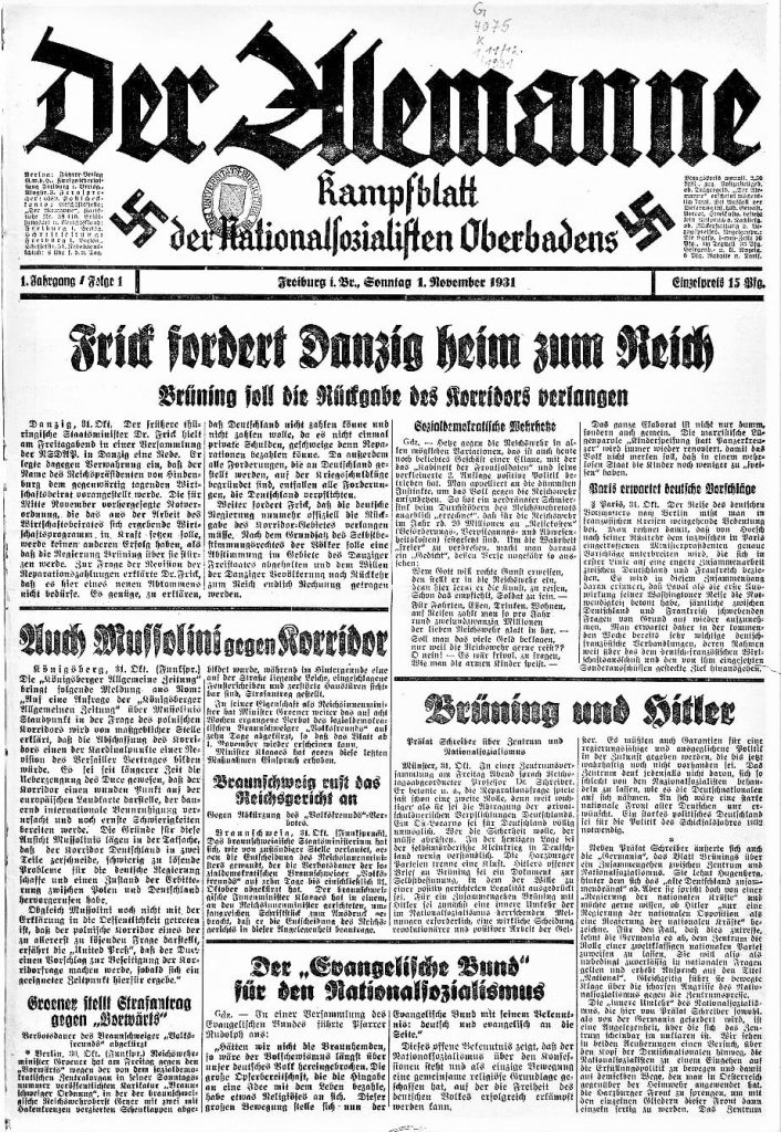 – „Der Alemanne“, das „Kampfblatt der Nationalsozialisten Oberbadens“. Im November 1931 gegründet, ging es im April 1945 mit dem bis zum Schluss verherrlichten Terrorregime der NSDAP unter.